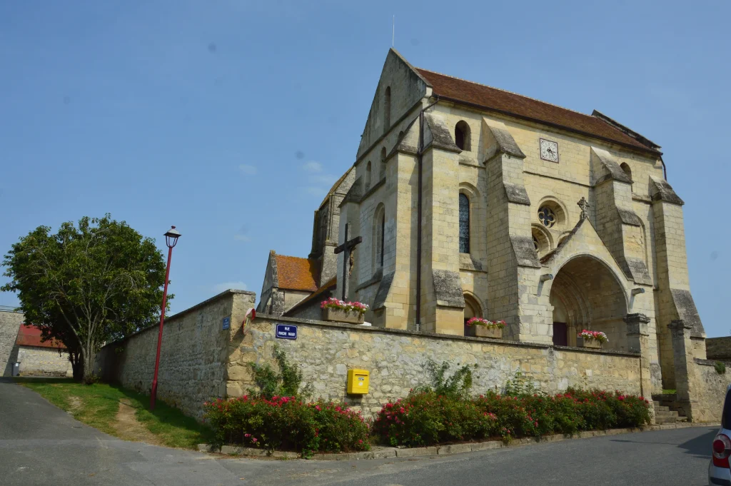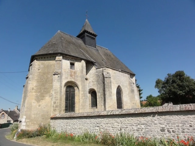 La première mention apparaît seulement en 1157 dans un acte de donation au chapitre cathédral. L’édifice actuel a été construit au troisième quart du 12e siècle et complété à la fin du siècle par le massif antérieur. Le décor sculpté du choeur et du transept, et notamment celui des chapiteaux du choeur, est très proche, voire identique, de celui de l’église de Lhuys, ce qui pourrait indiquer un même atelier, et peut-être une même main.